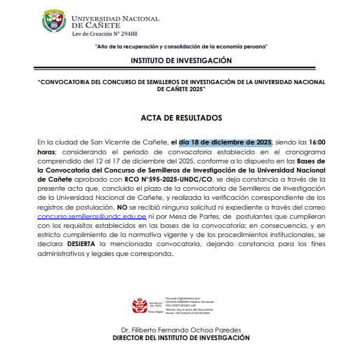 Se publica el ACTA DE RESULTADOS del la «CONVOCATORIA DEL CONCURSO DE SEMILLEROS DE INVESTIGACIÓN DE LA UNIVERSIDAD NACIONAL DE CAÑETE 2025» día 18 de diciembre de 2025.